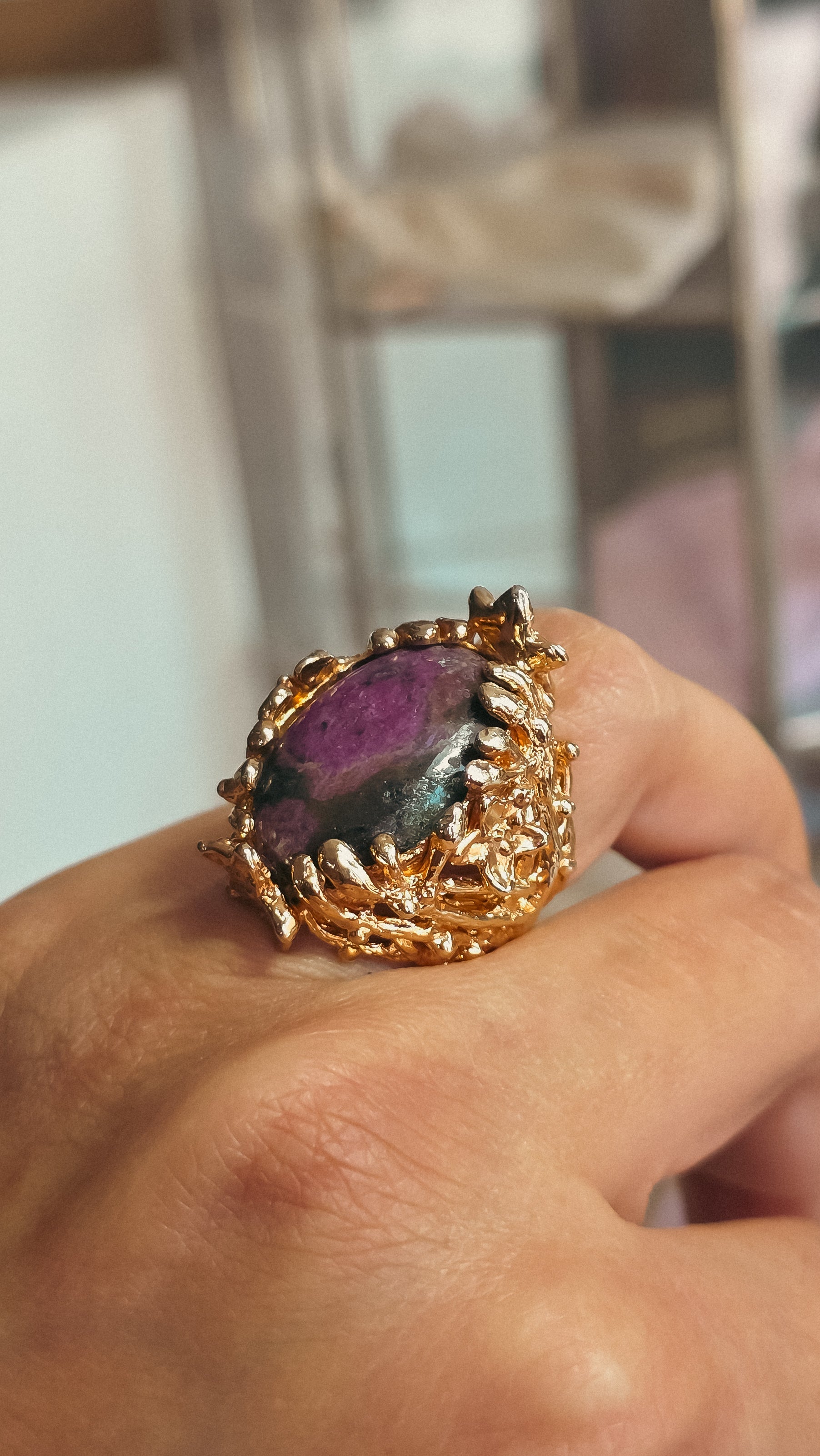 Un anillo inspirado en el árbol de flor de cerezo con un rubí zoisita. Listo para brillar en tus manos. ✨