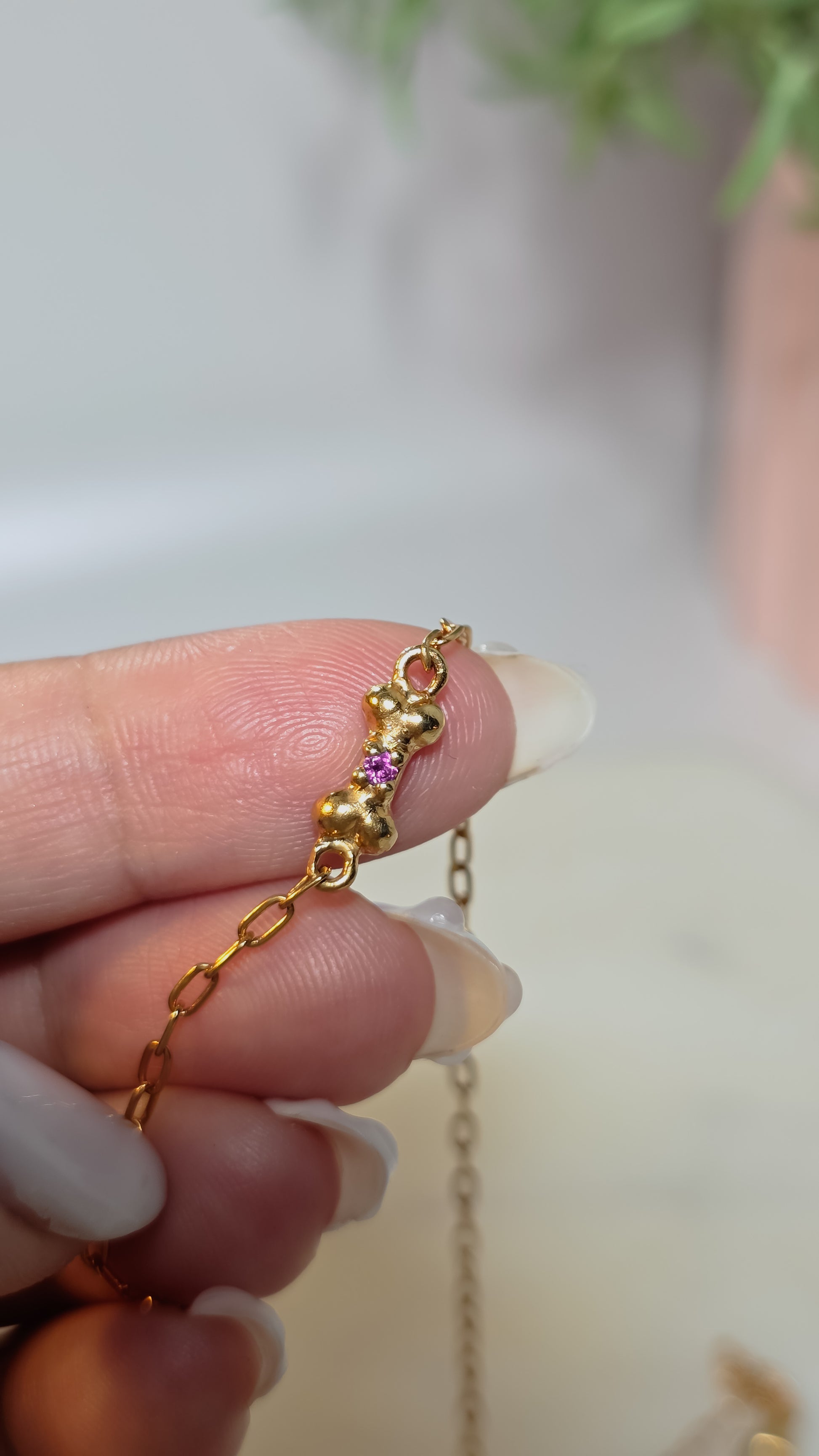 Lleva contigo una joya única y significativa: un dije en forma de Huesito con un granate rodolita natural de 2mm.