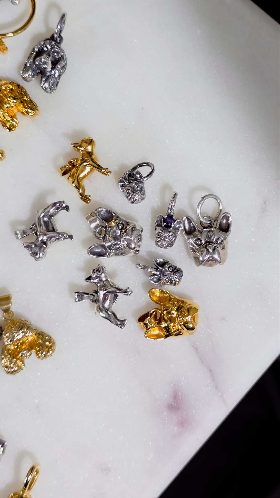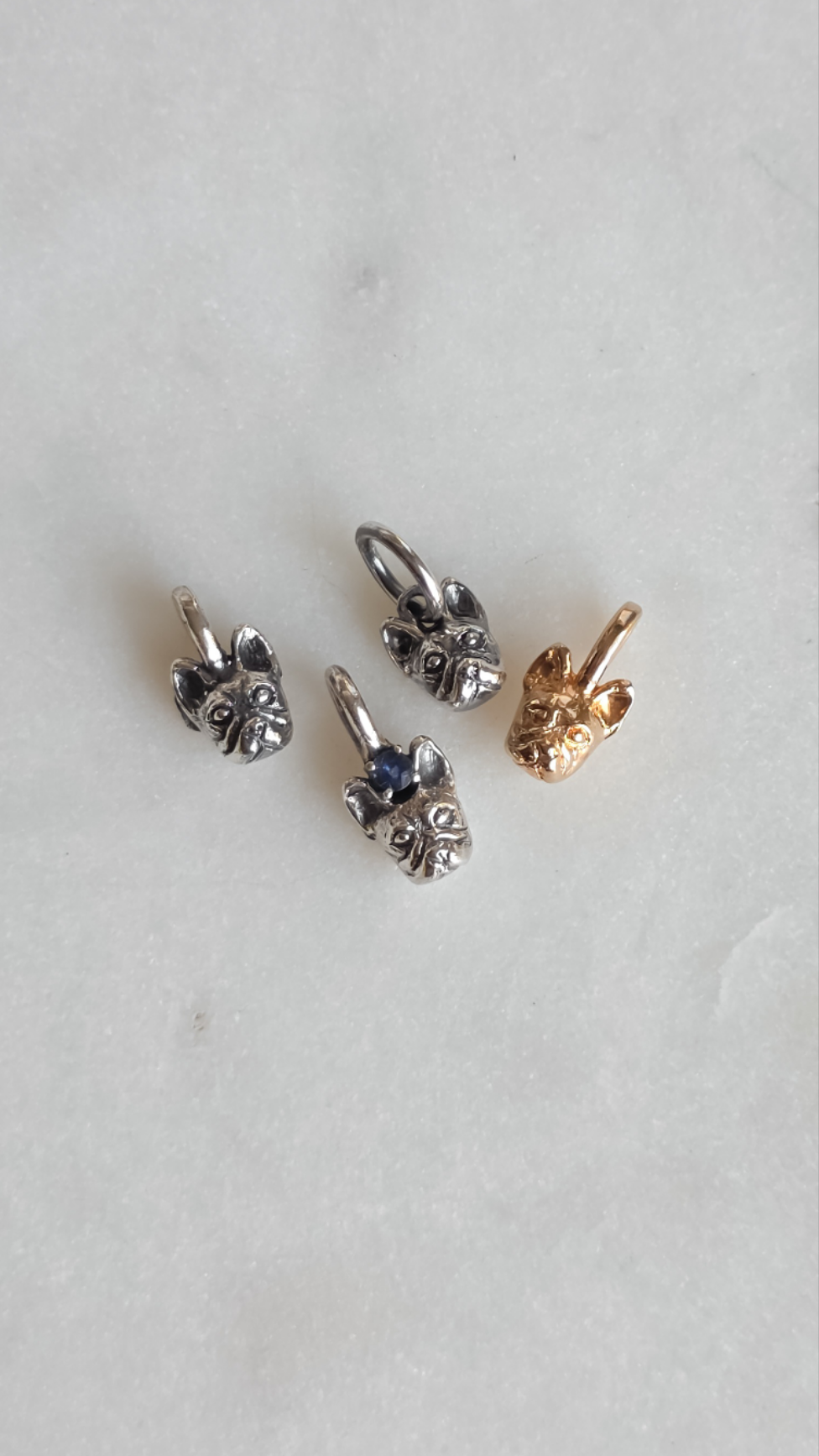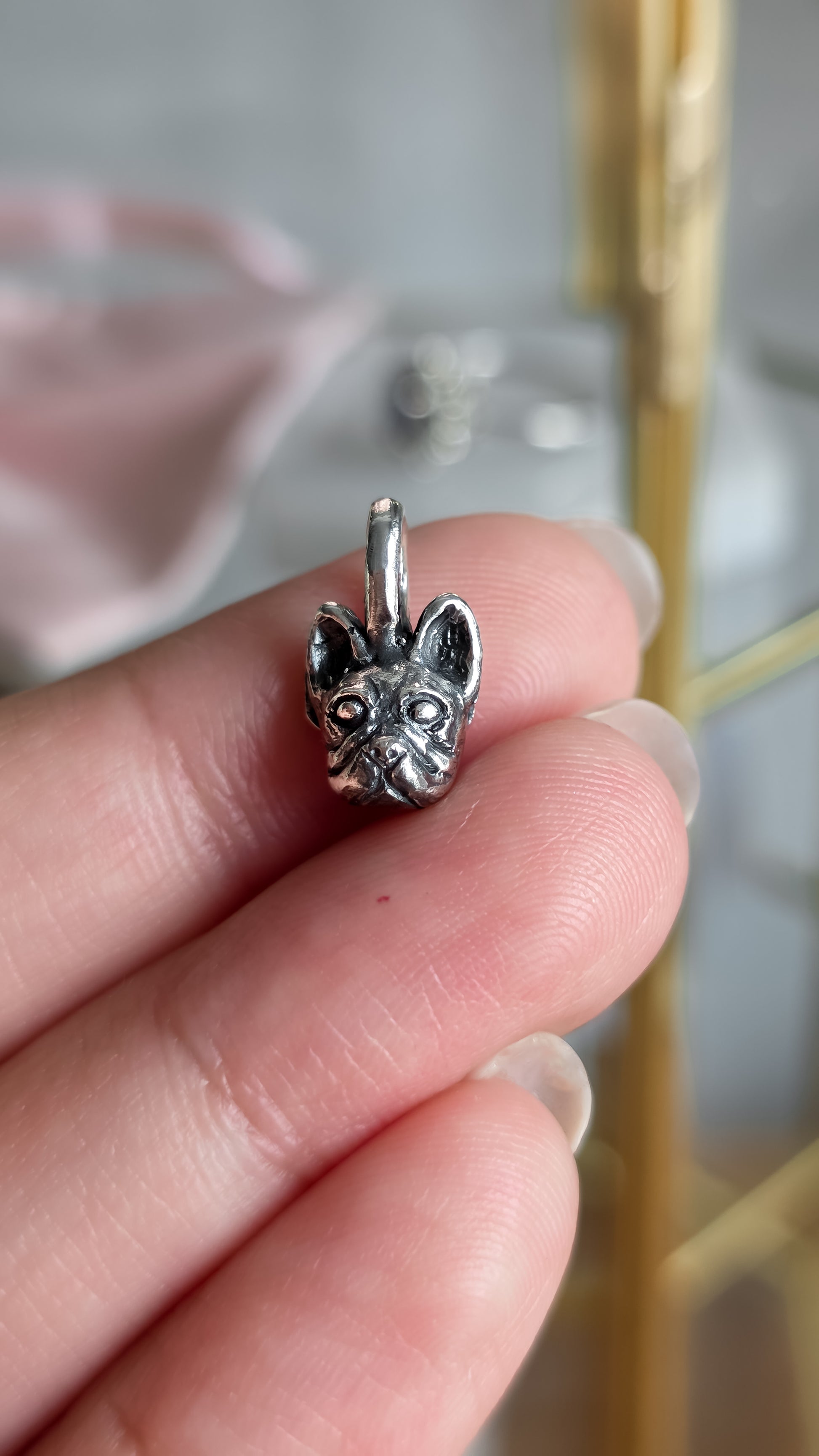 Lleva contigo una joya única y significativa: un dije en forma de carita de Bulldog francés.