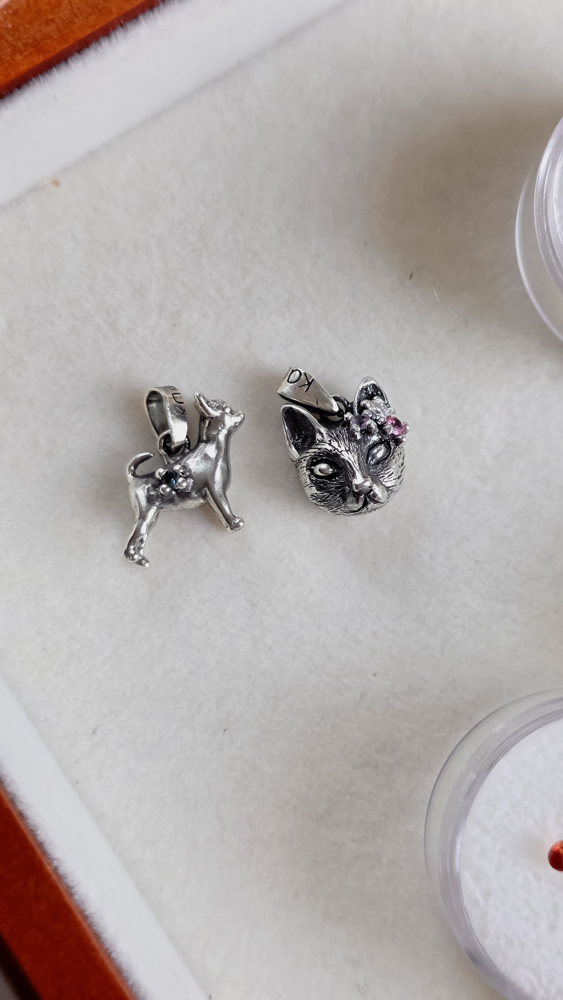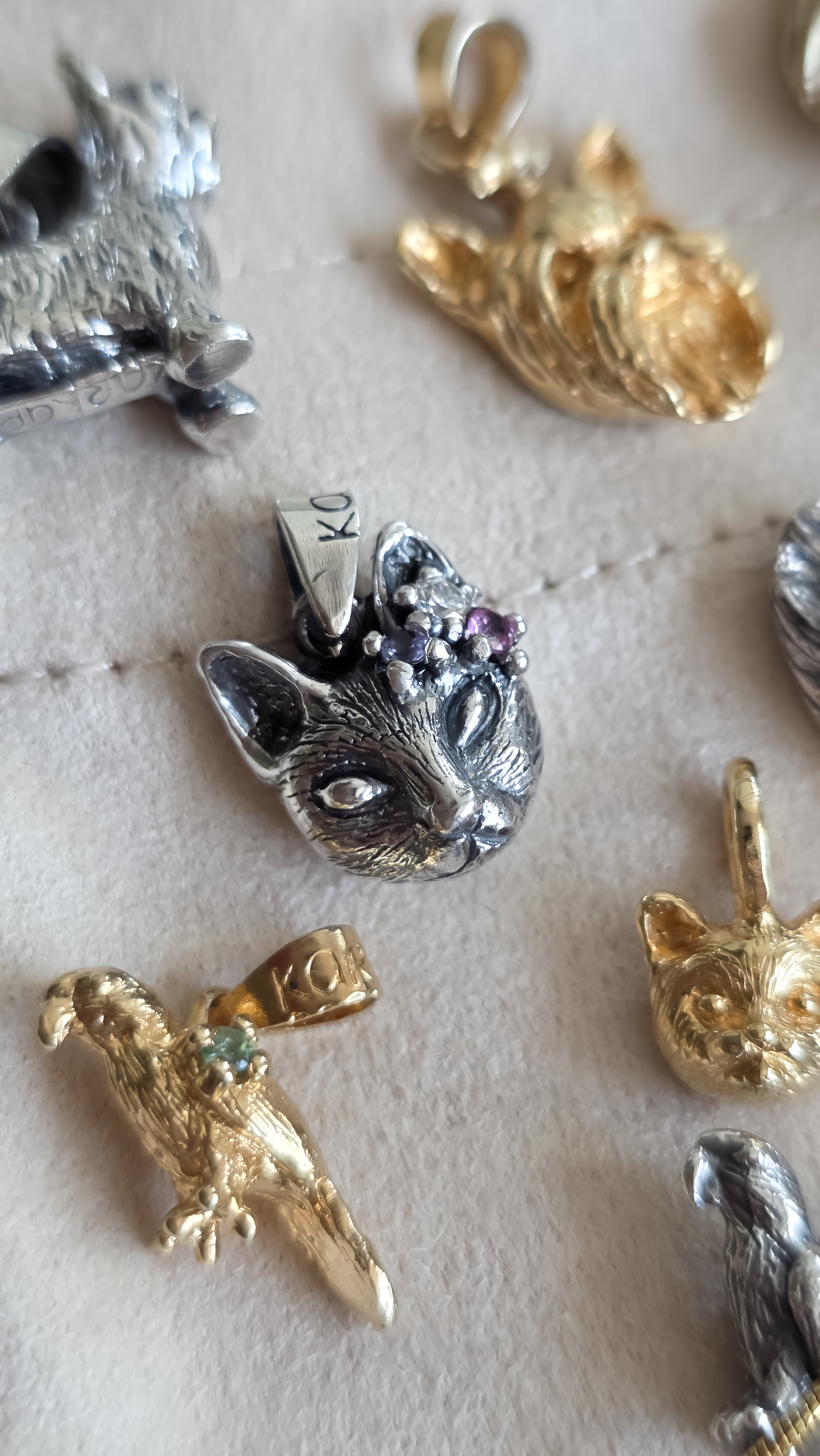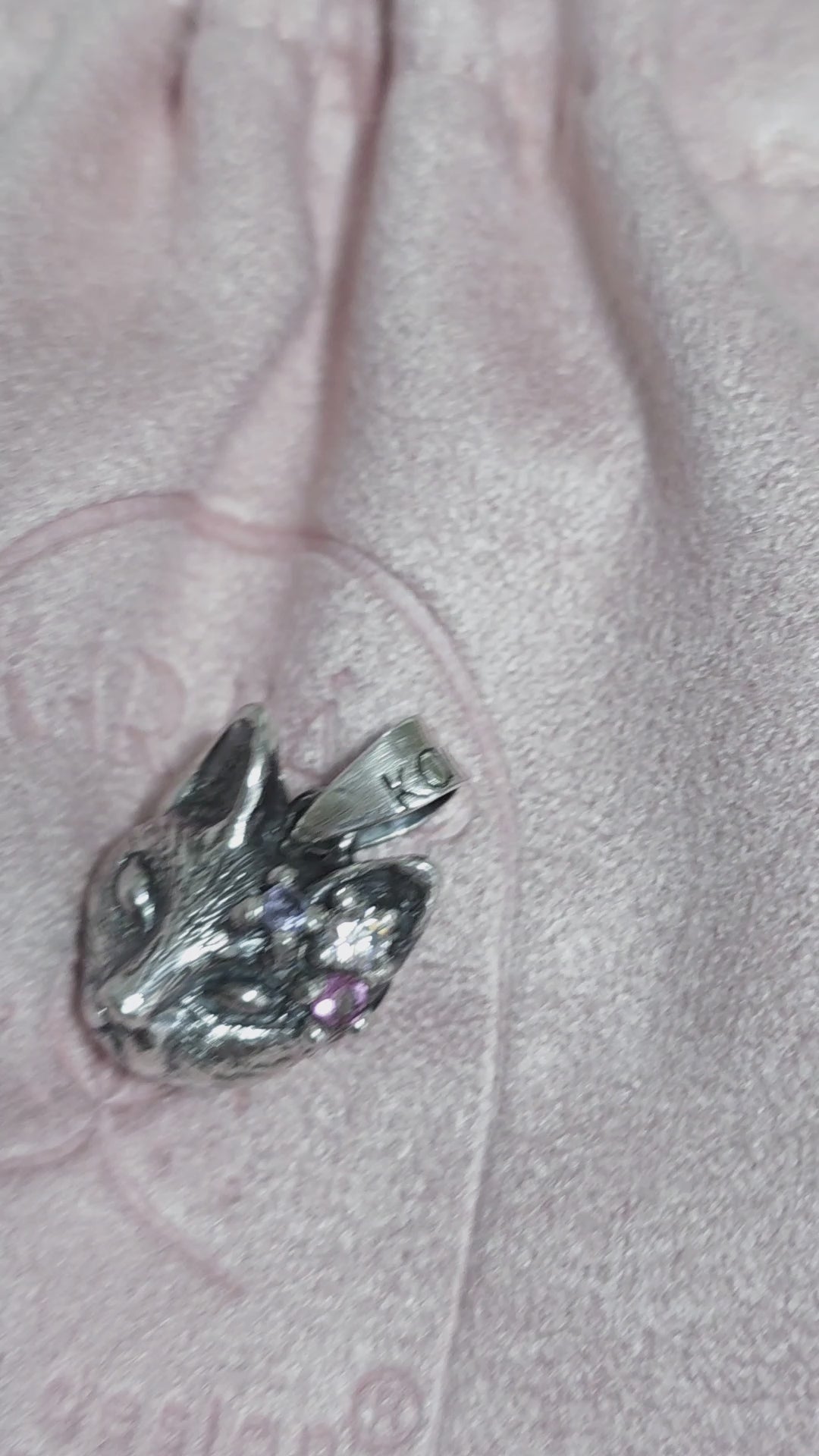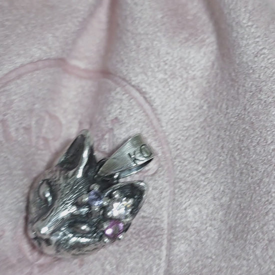 Lleva contigo una joya única y significativa: un dije en forma de carita de Gato con una moissanita, una tanzanita y una turmalina rosa.