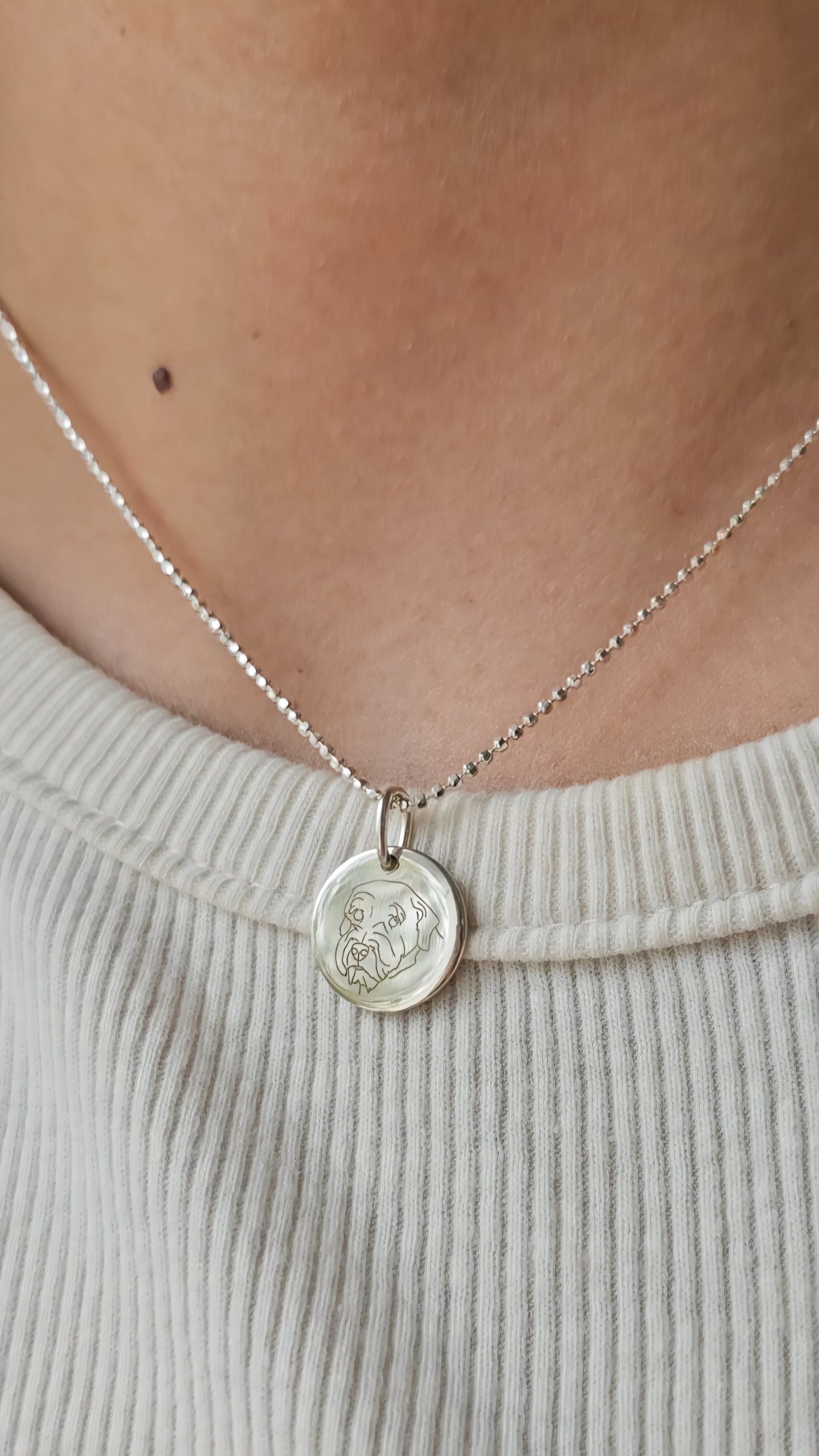Lleva contigo una joya única y significativa: Una medallita plana con la cara de tu perrito o gatito grabada.